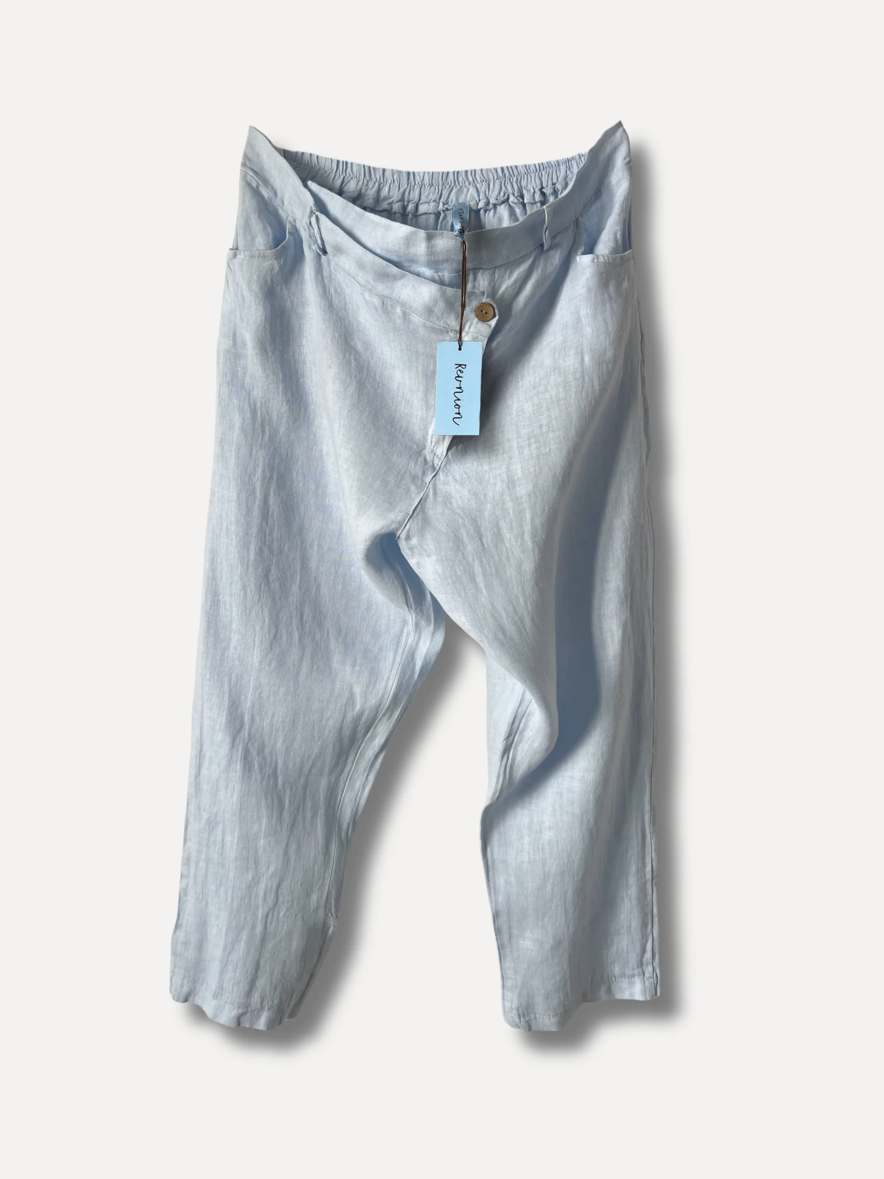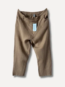 En jättecool linnebyxa i en skön loosefit modell, lite snedställd knäppning framtill,resår baktill , bredare midjemått de sk hänga på höften och det finns hällor för bälte, kortare ben till ankeln.
