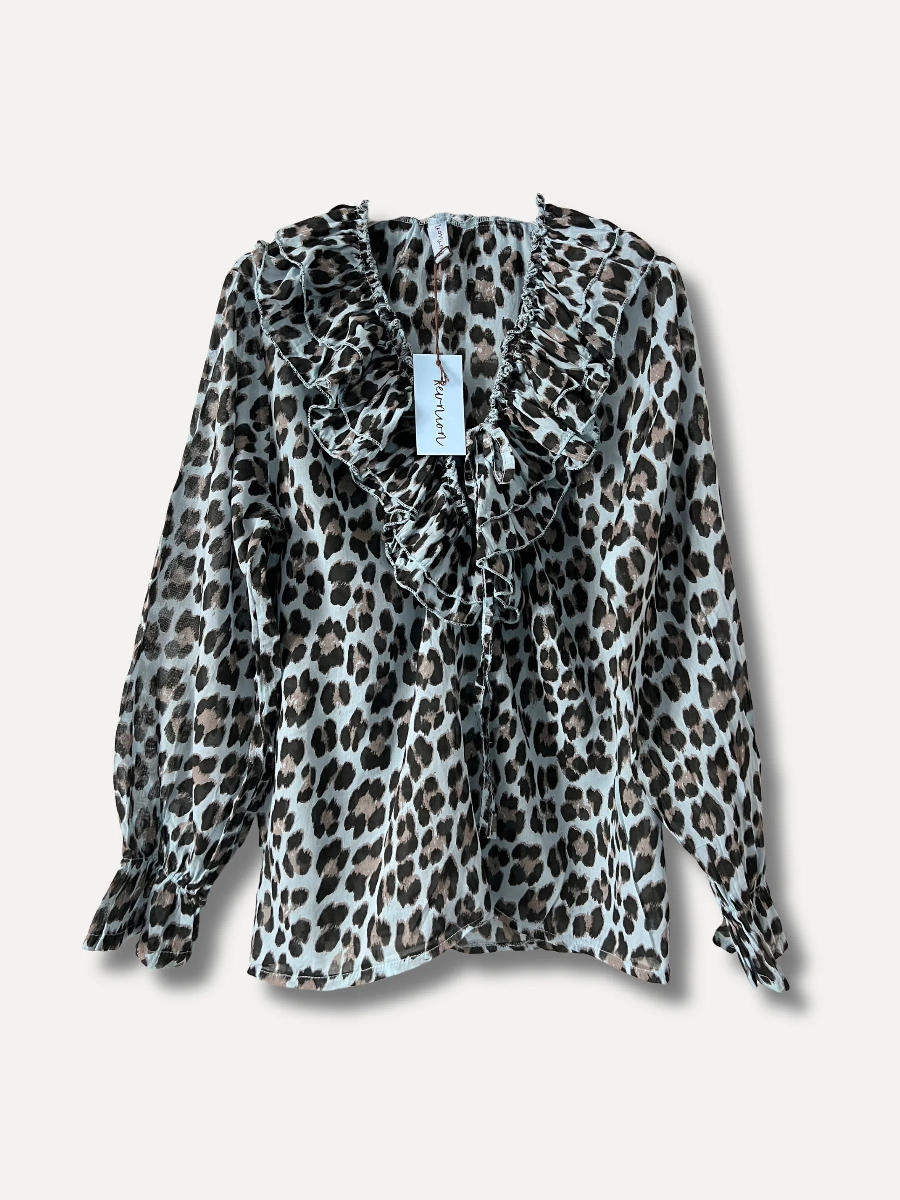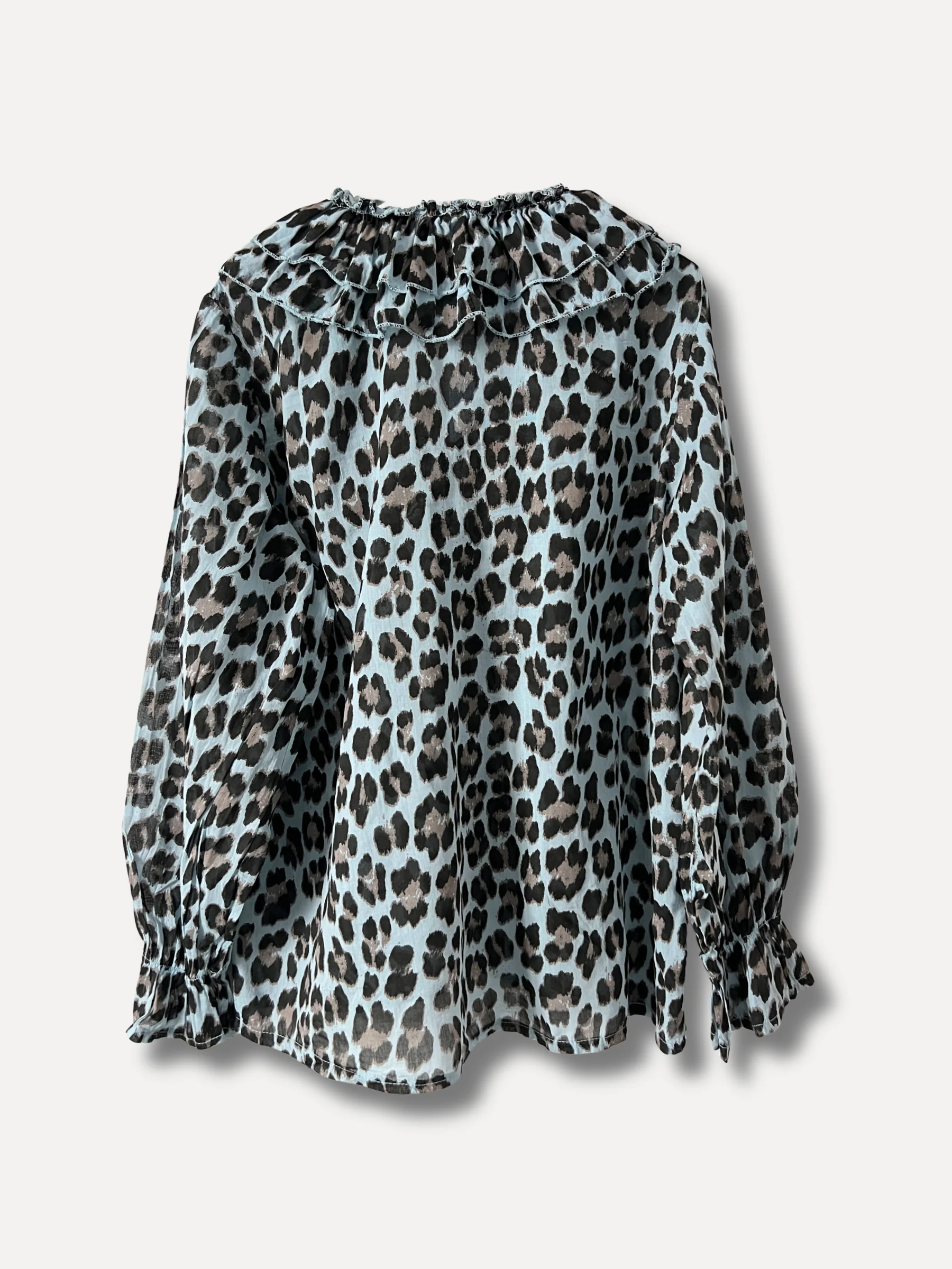 Till alla leolovers , en ursnygg variant på ljusblå botten med trycket i brunt/beige, härlig volang i dubbelt tyg runt halsen, knytband, resår i ärmen avslut. Finns i två storlekar S/M och L/XL tunn skön bomull från svenska Reunion