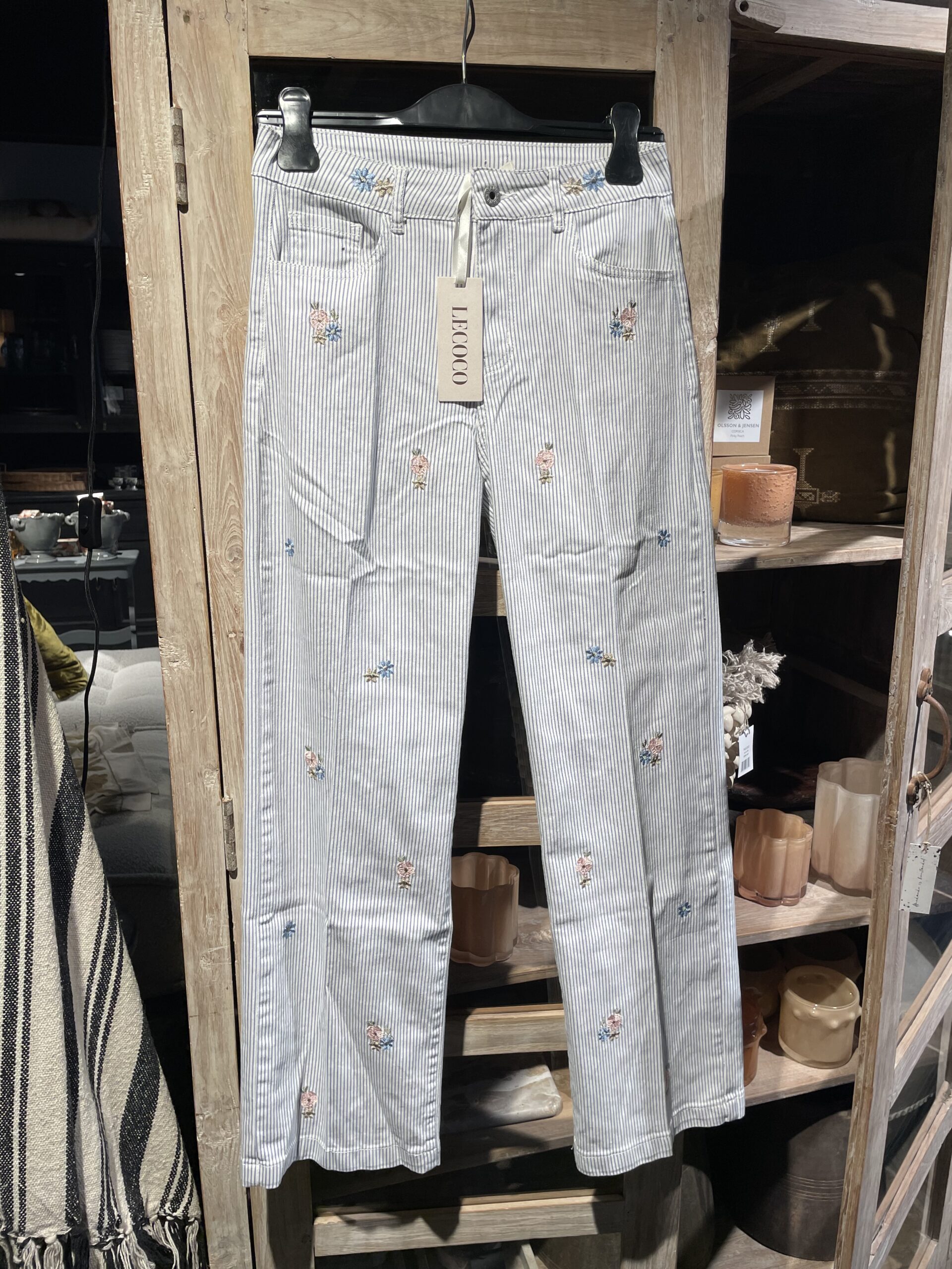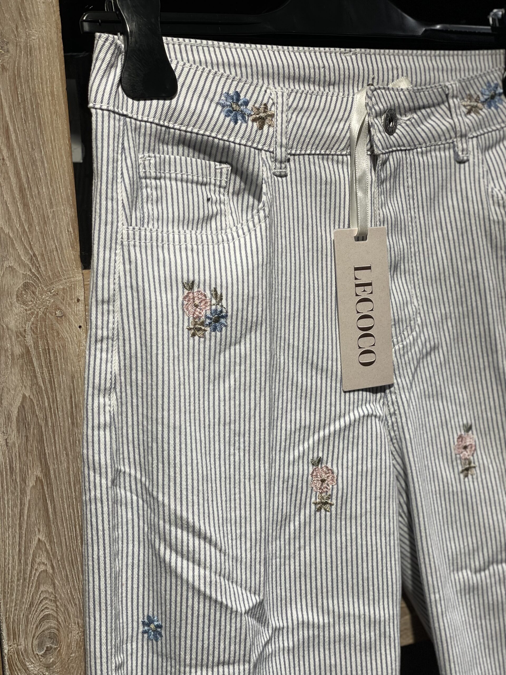 En snygg sommarbyxa i smalrandigt jeansblått på vit botten, små broderade blommor utspridda över byxan, skön stretch och jättesnygg passform, fickor fram och bak, rak vid modell. Finns i storlek S/M/L/XL/XXL kommer från det danska märket Lecoco.