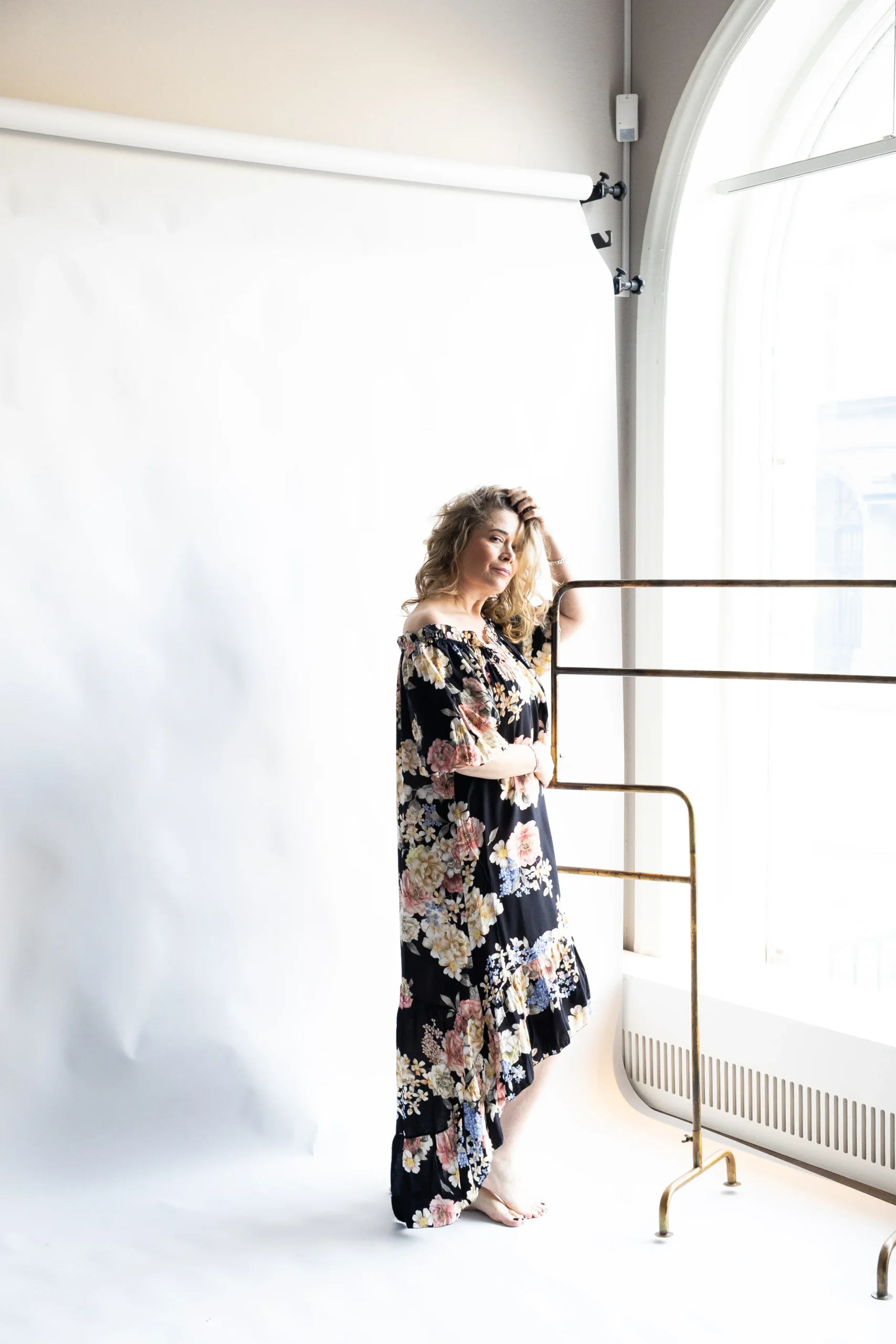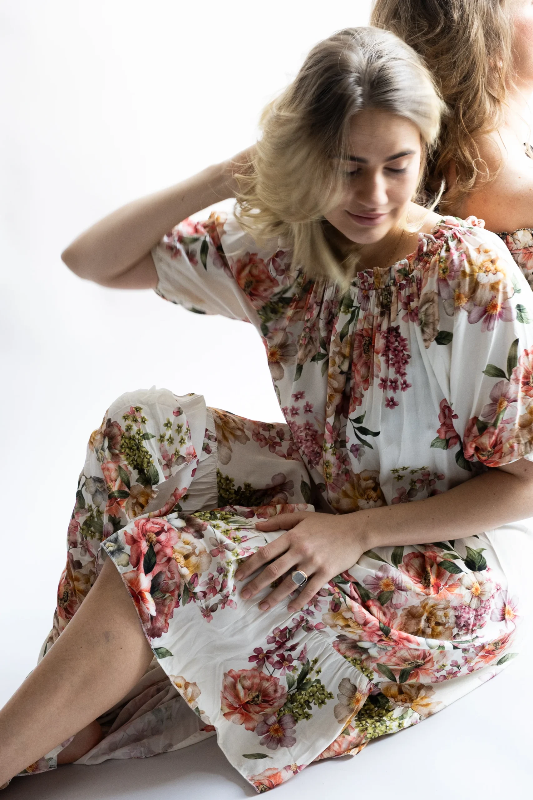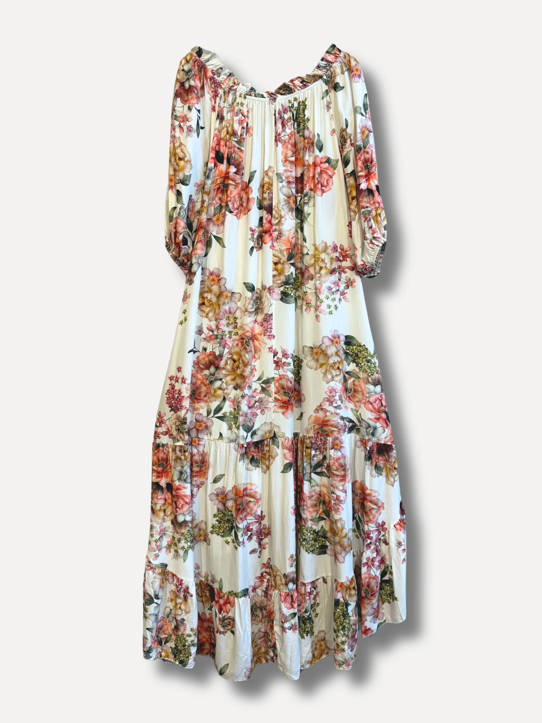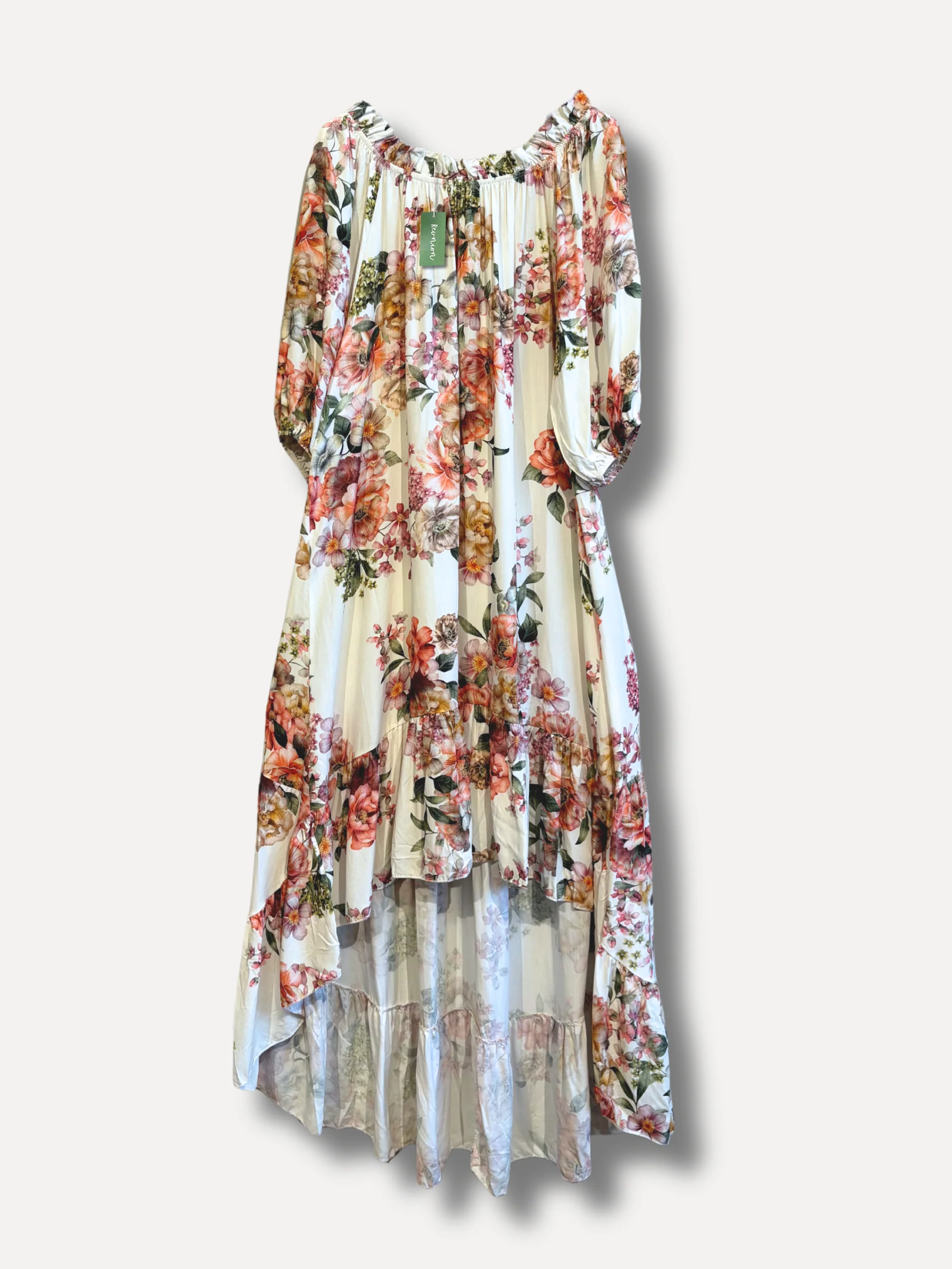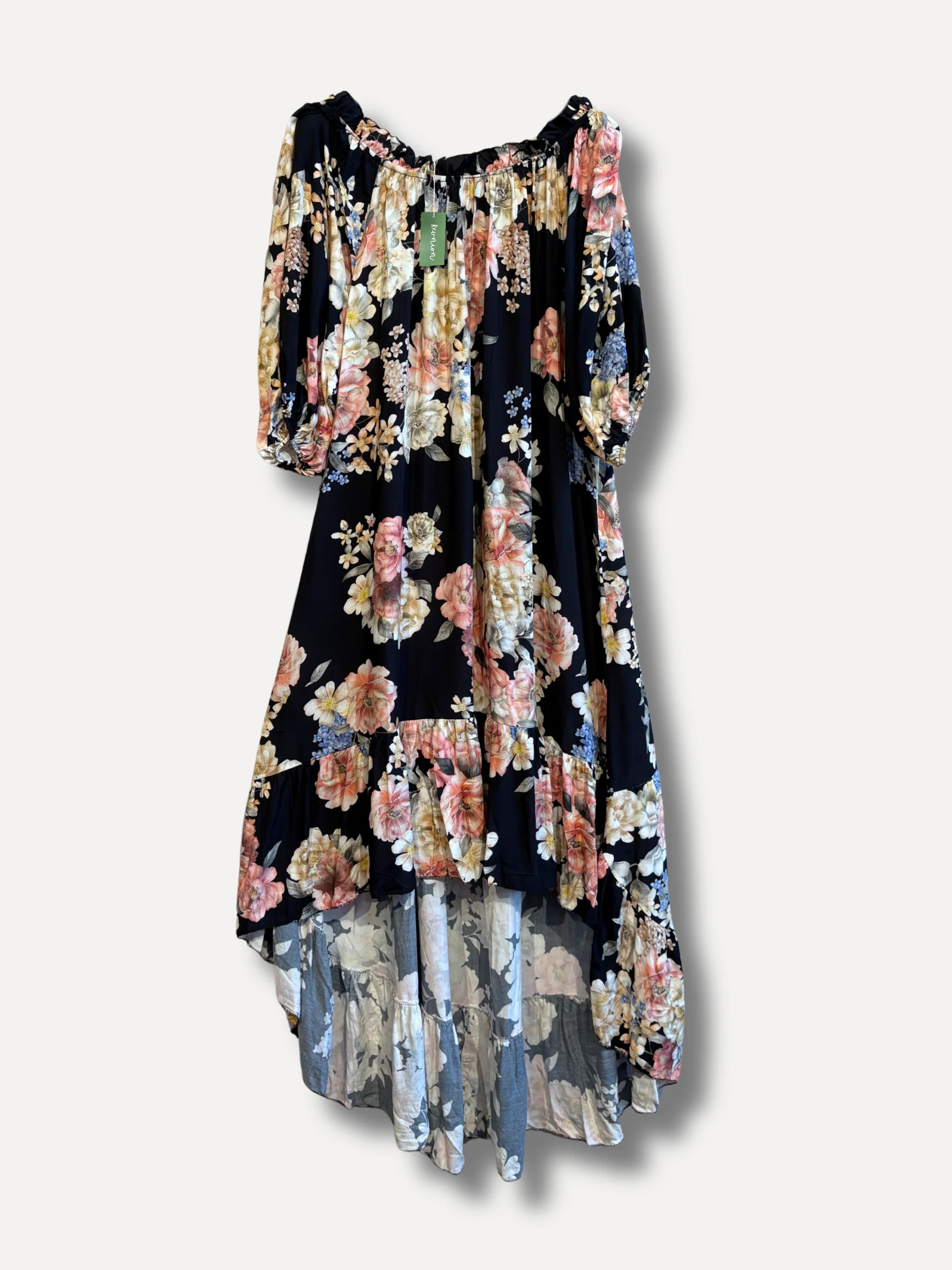 Mjuk kvinnlig hippieromantisk klänning i viskos, fin halsringning med resår så man kan bära den båtringad eller nedhasad på axeln. Bred volang nedtill, kortare fram, trekvartsärm med mycket vidd och resår, en riktigt fin klänning till sommarens fester.