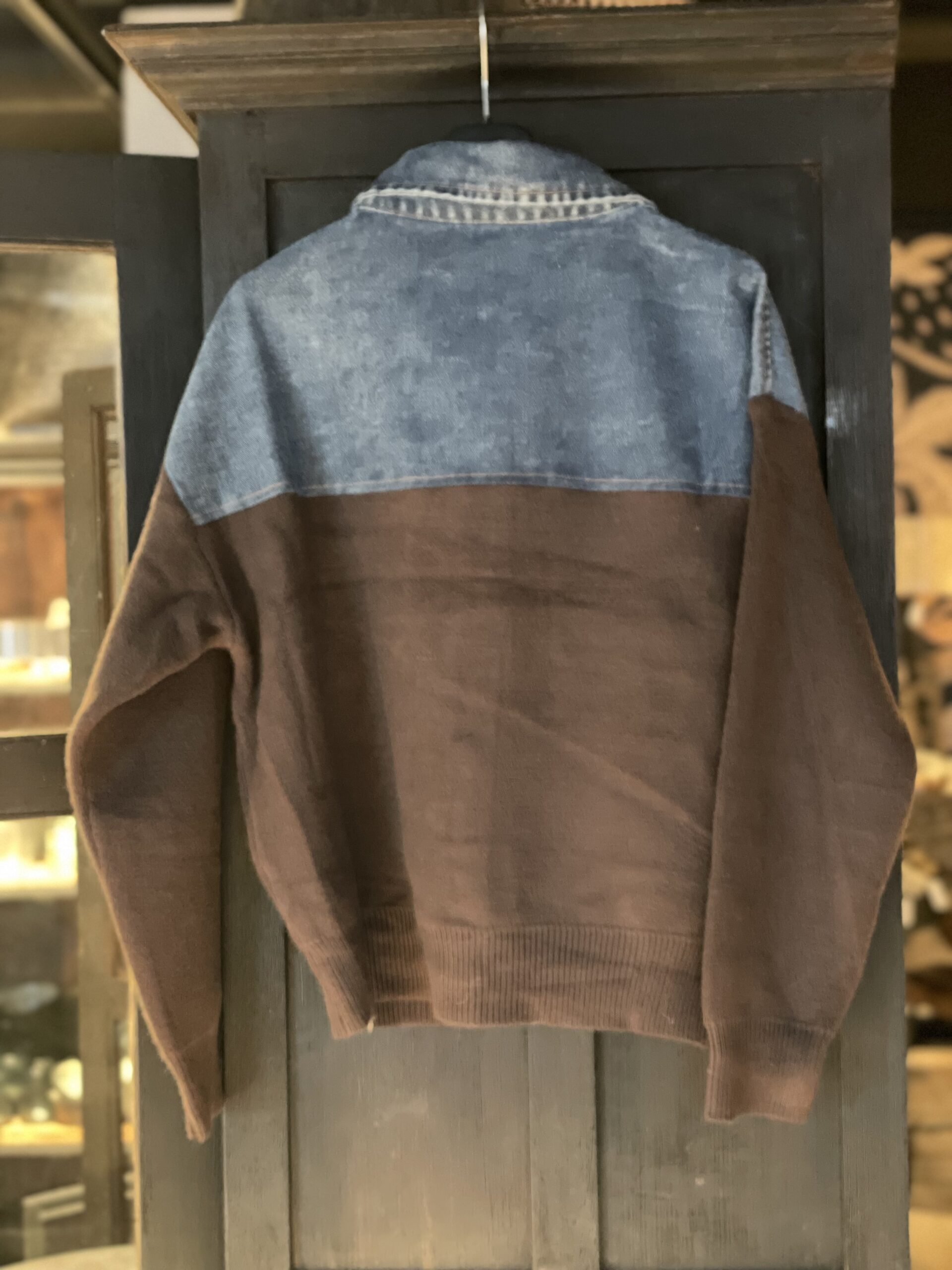 Fin härlig höstjacka i jeanstyg och brunt stickat, knäppning framtill och bröstfickor. One size passar upp till en 42 ,60% viskos 30polyester 10elastan fintvätt 30grader.