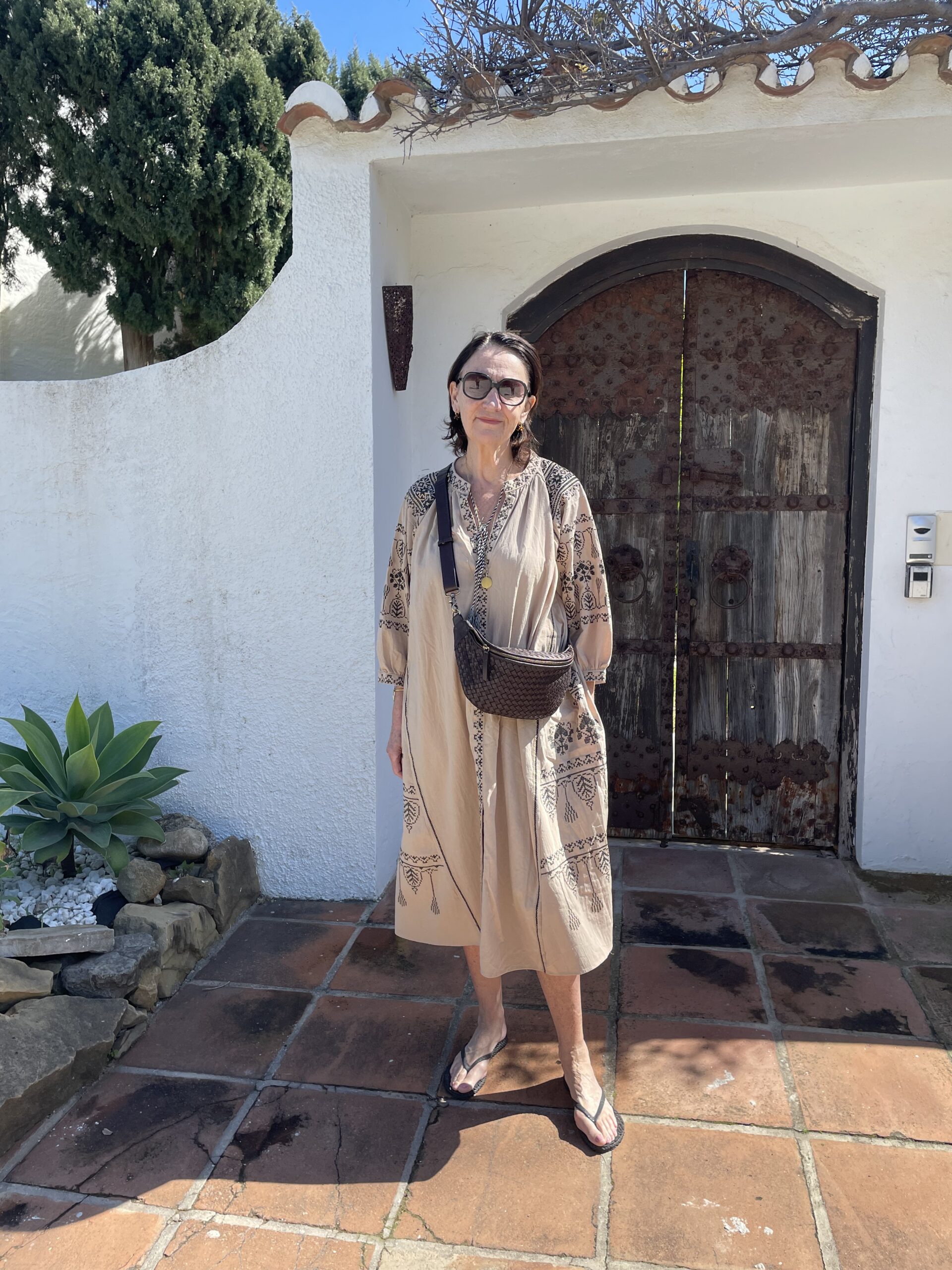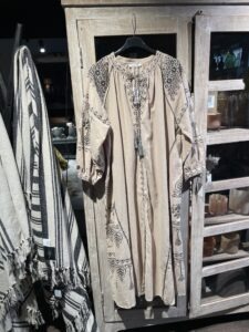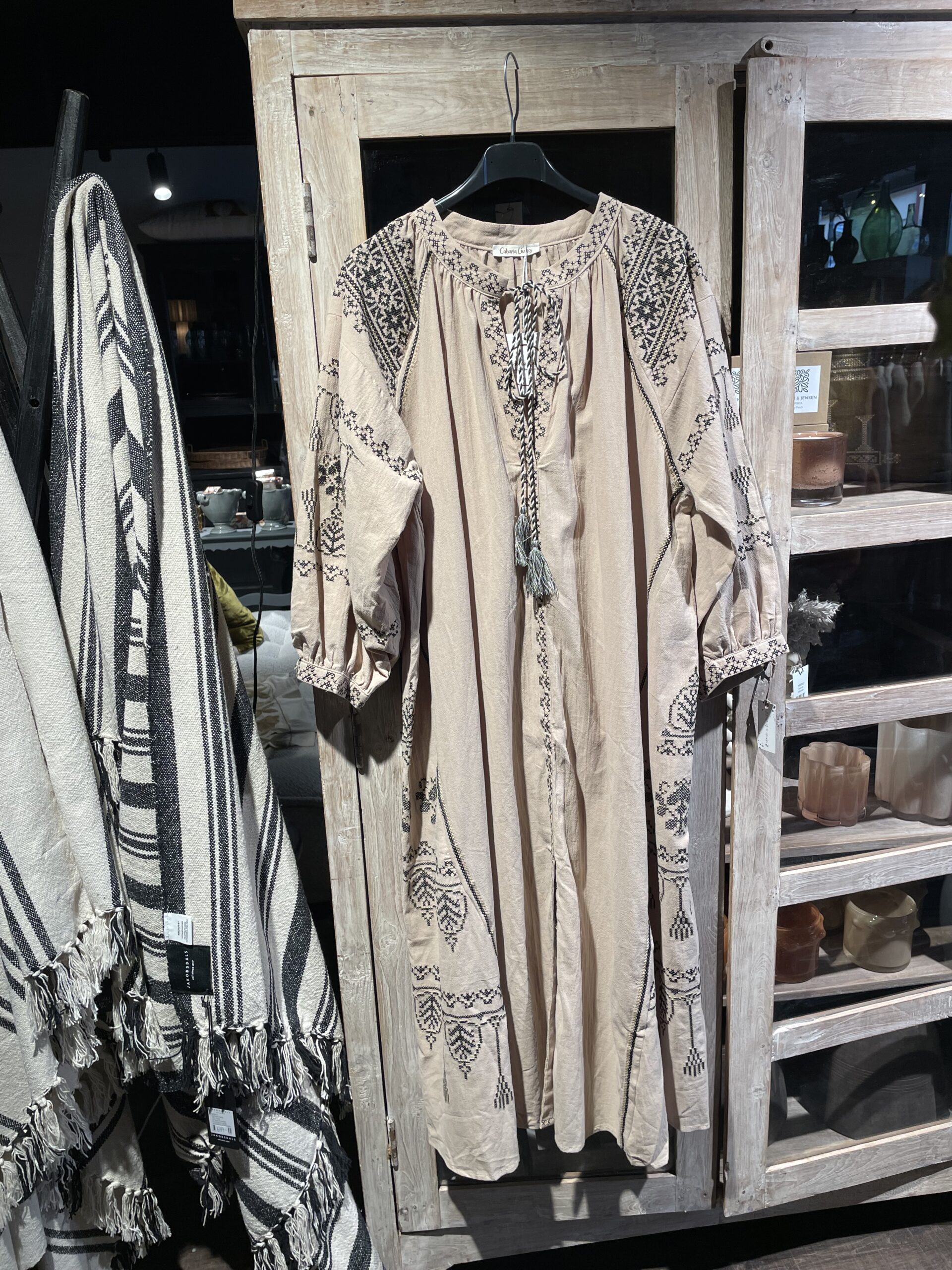 Vasd är bättre och skönare än en snygg kaftanklänning, jag älskar att gå i dessa på sommaren. Vida sköna, snygga med detaljer som brodyr , kvinnligt och passar verkligen för alla åldrar. Sätt ett par lite stora kul örhängen till, platta sandaler och en kul sommarväska och du har den tidlösa Boholuxe looken perfekt. Lika snyggt på dagen som på kvällen. Den här modellen är i khakibeige botten med svart brodyr, knyt vid halsen med band/tofsar, 100% bomull, one size från danska Cabana living. Ankellång modell.