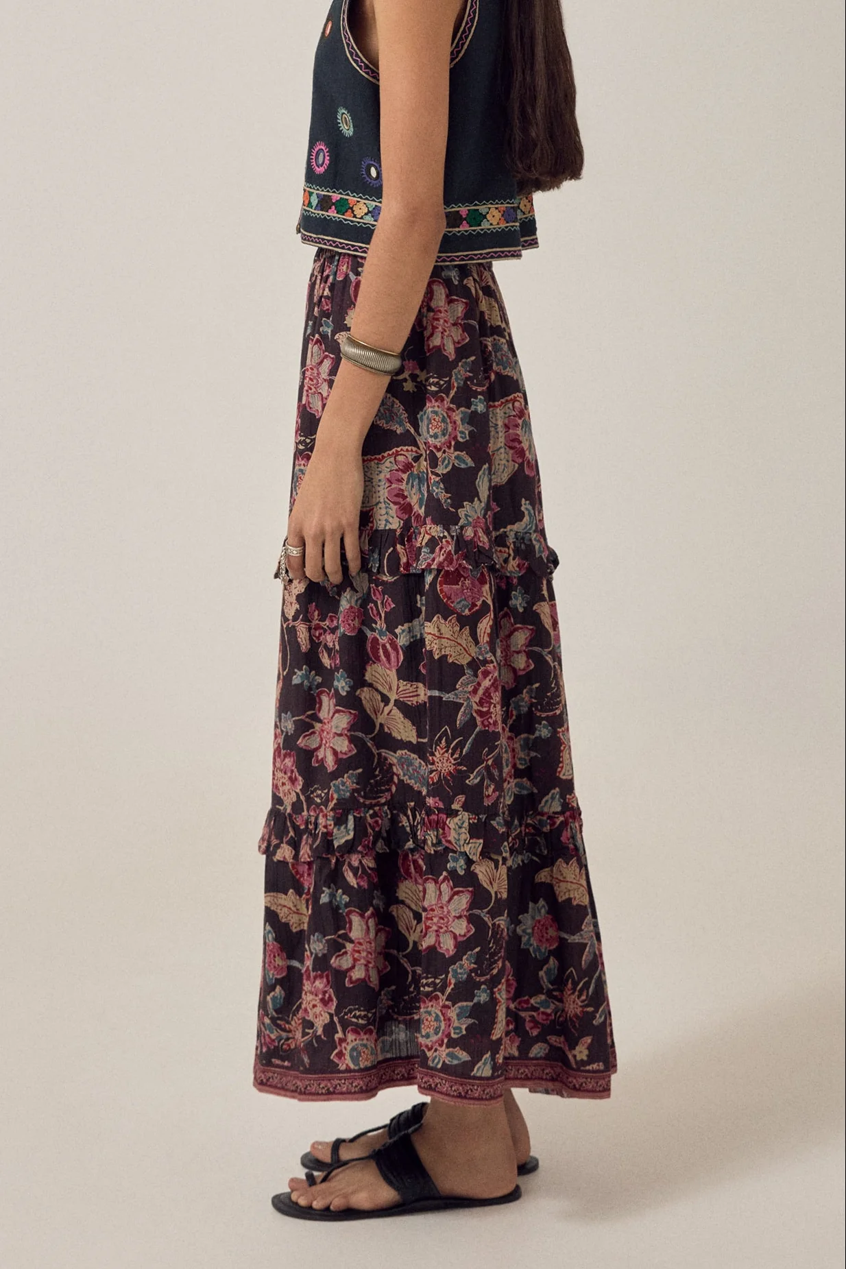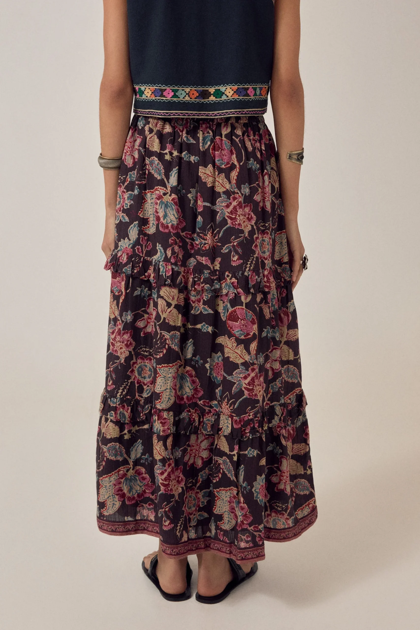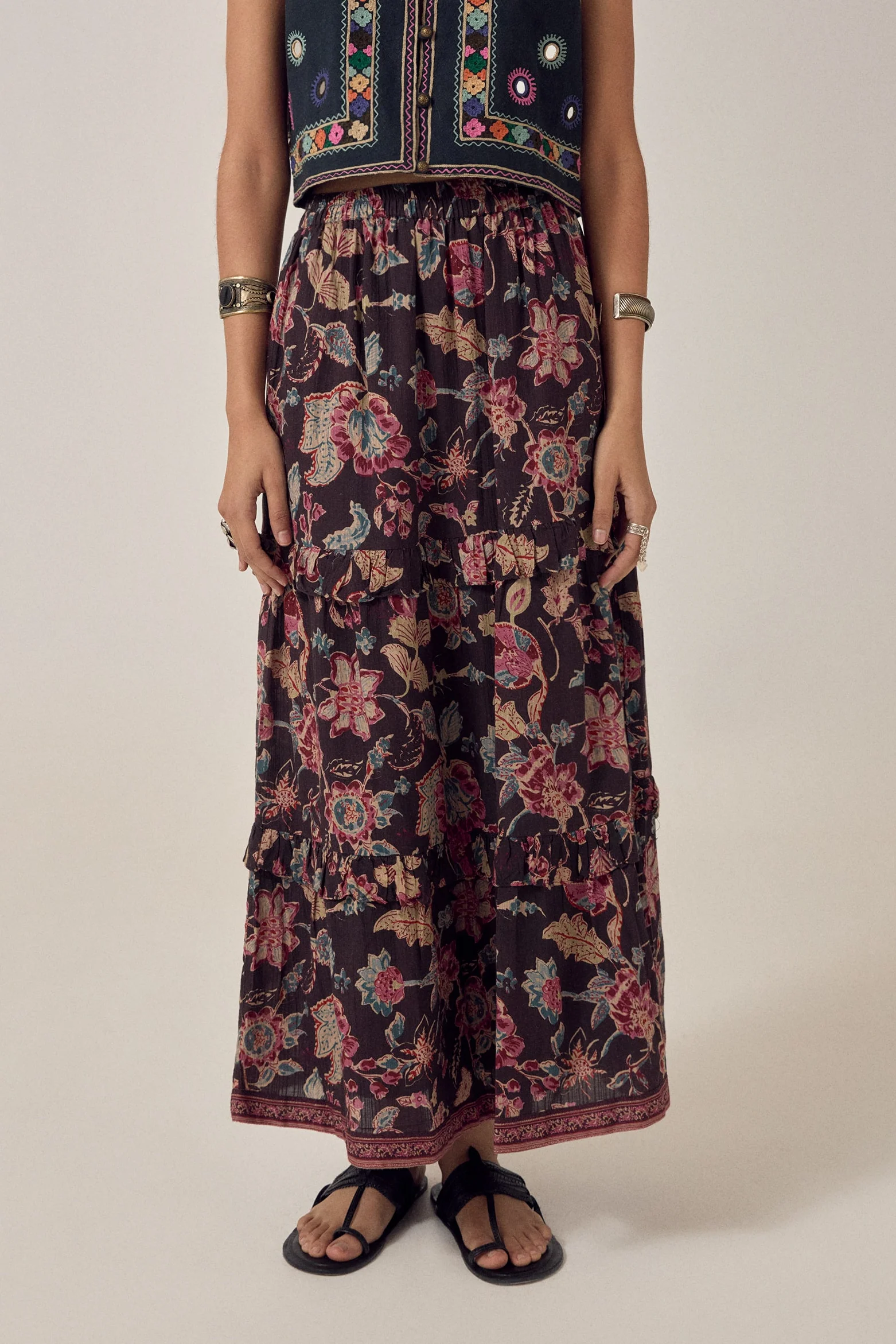 Vacker kjol i vackert tyg, svart botten, beige, pepparrosa, blått mönster. Tre våder, helfodrad och resår i linningen.