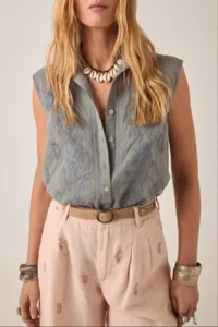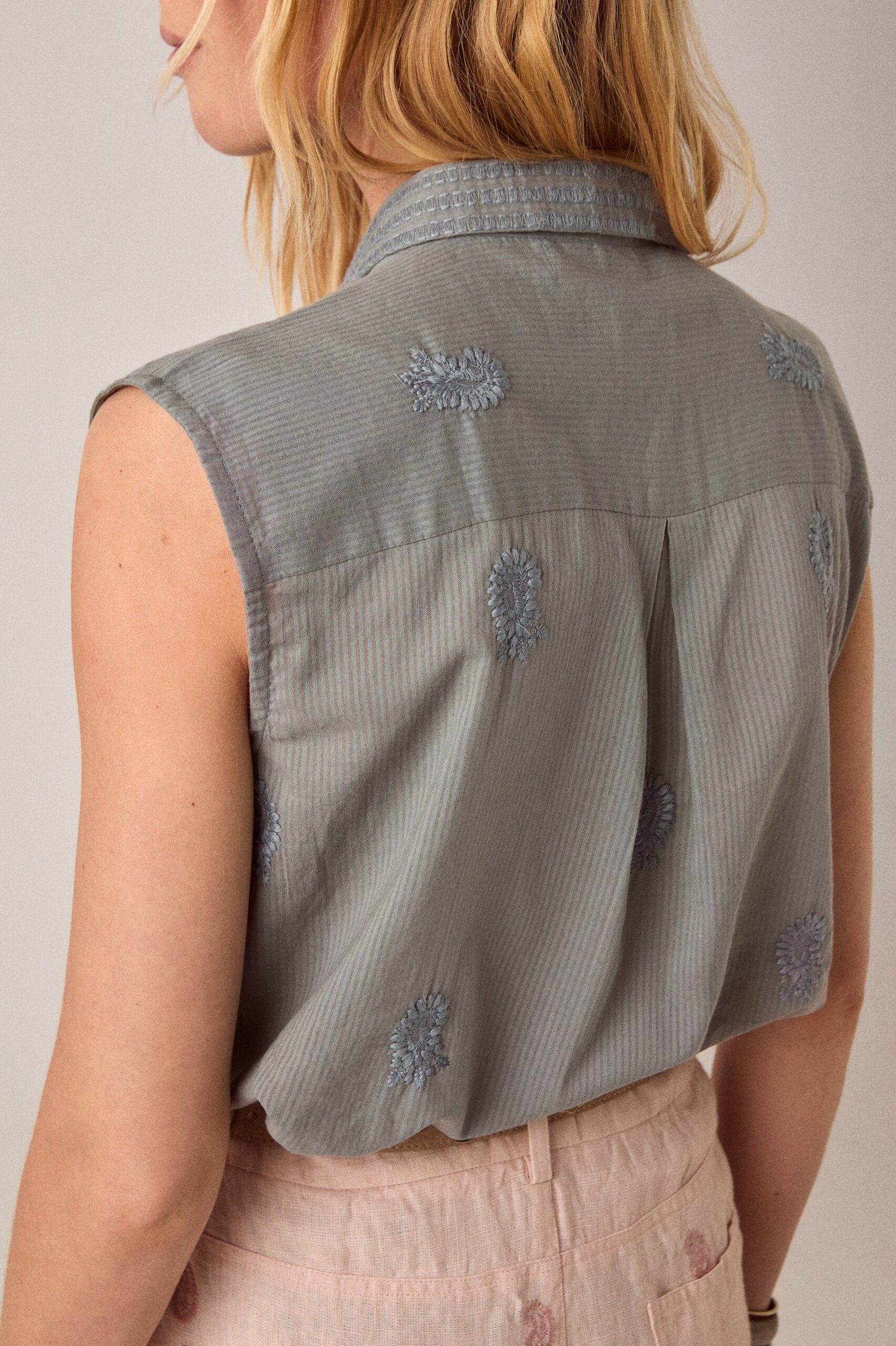 Vacker blus i en skön tunn bomull med lite struktur av bäckebölja, vackert broderad, ärmlös. Krage och knäppning framtill, en fin grågrön färg. Finns i storlek S/M/L/XL kommer från det spanska modehuset Maison Hotel.