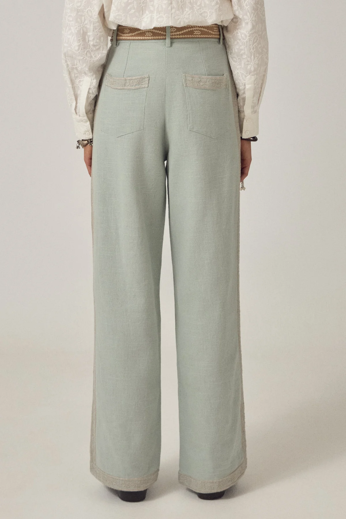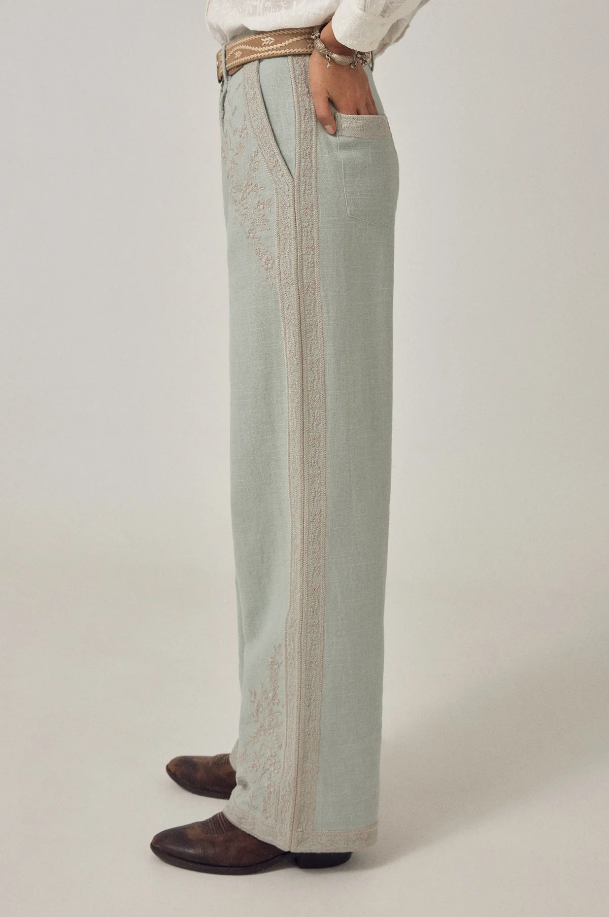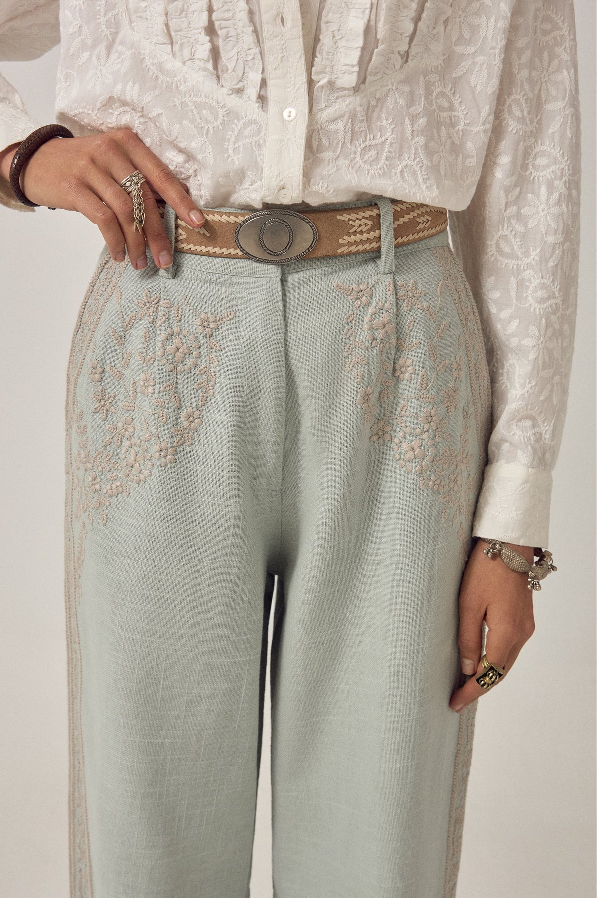 En fantastiskt snygg byxa i en mintgrön färg, broderad vid fickor, utmed sidorna och nedtill på byxan. Modellen är en klassisk kostymmodell med raka ben, lagda veck och fickor, hällor. Sitter skönt med lite högre midja, väldigt fin passform. Finns en fin väst att matcha till byxan som heter Filippo. Från det spanska boholuxe märket Maison Hotel. 100% bomull Handtvätt