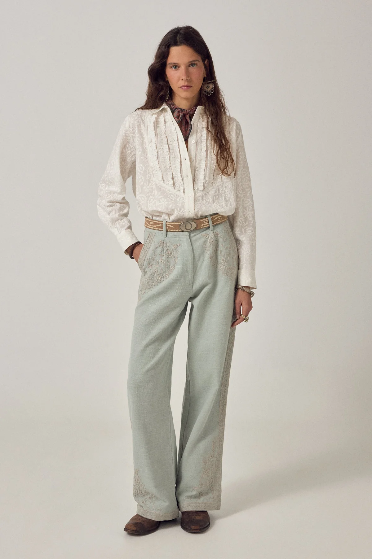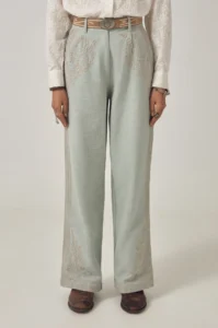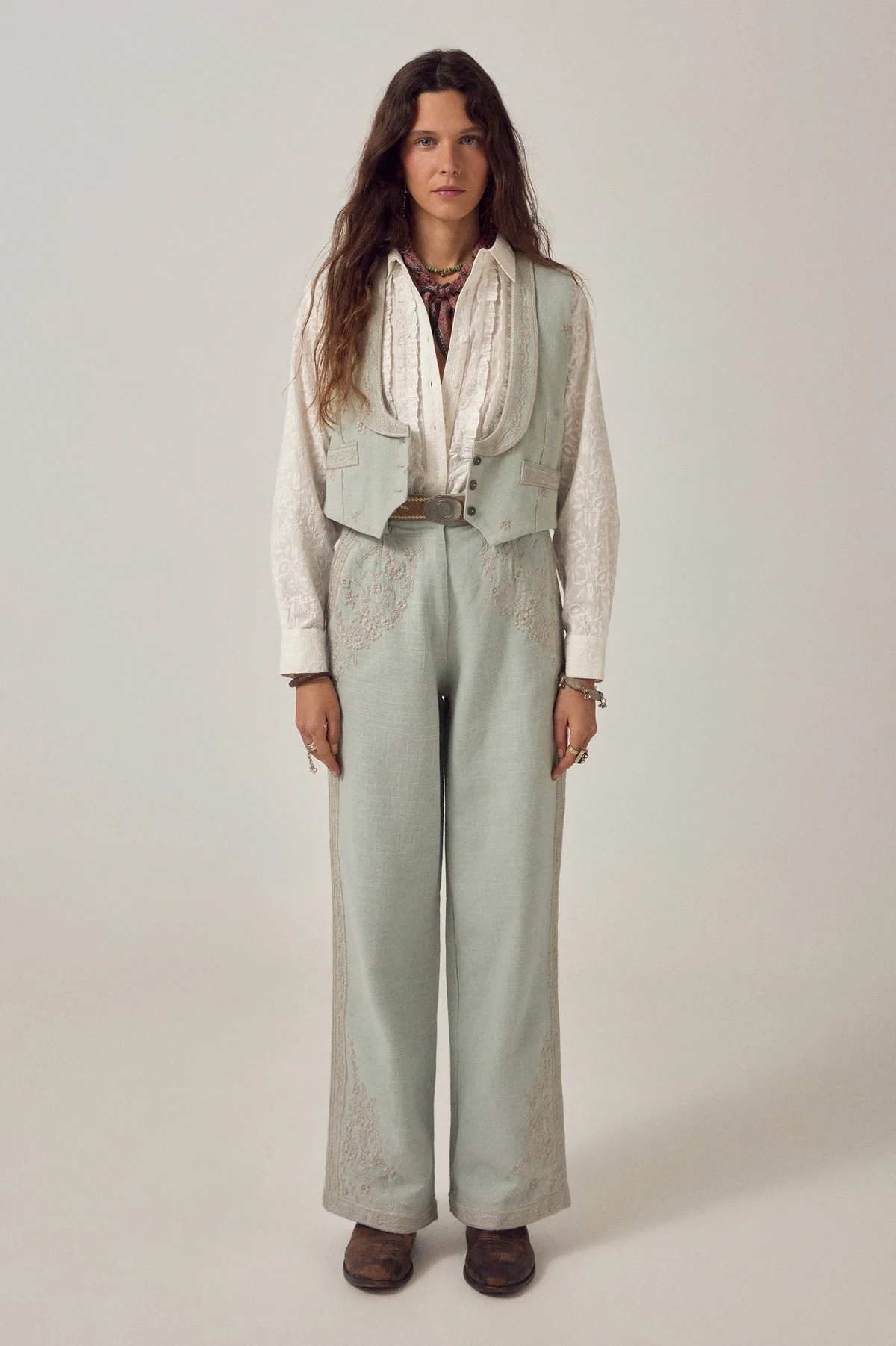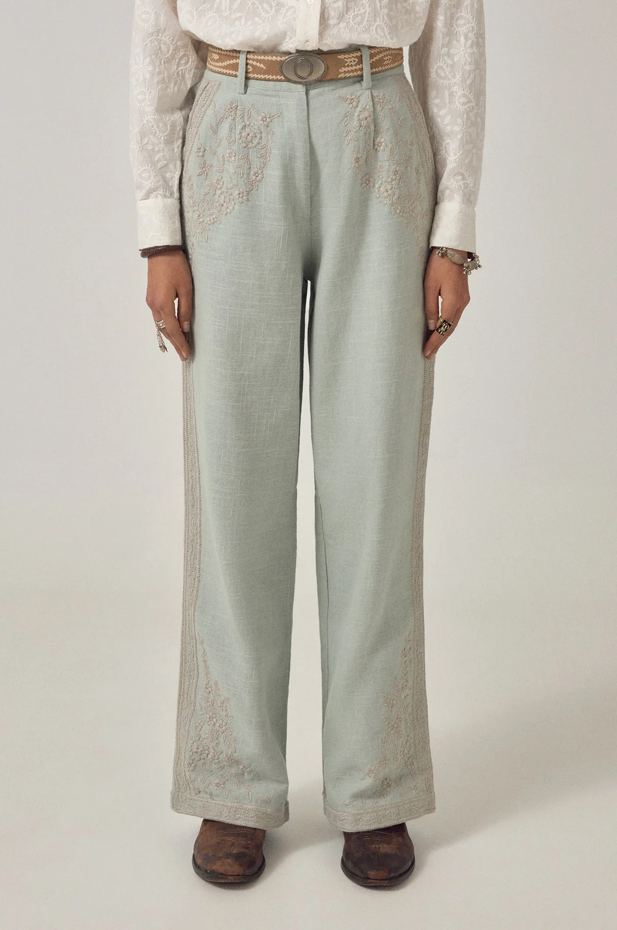 En fantastiskt snygg byxa i en mintgrön färg, broderad vid fickor, utmed sidorna och nedtill på byxan. Modellen är en klassisk kostymmodell med raka ben, lagda veck och fickor, hällor. Sitter skönt med lite högre midja, väldigt fin passform. Finns en fin väst att matcha till byxan som heter Filippo. Från det spanska boholuxe märket Maison Hotel. 100% bomull Handtvätt