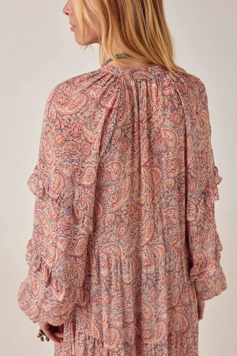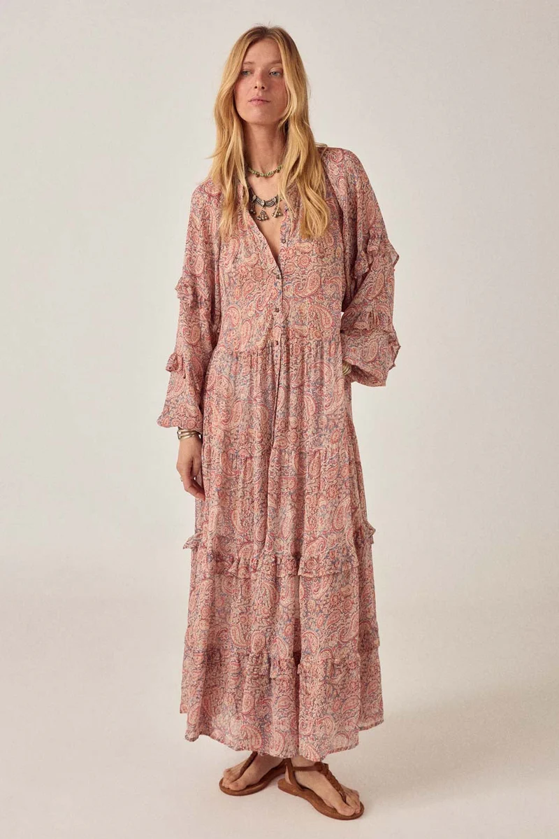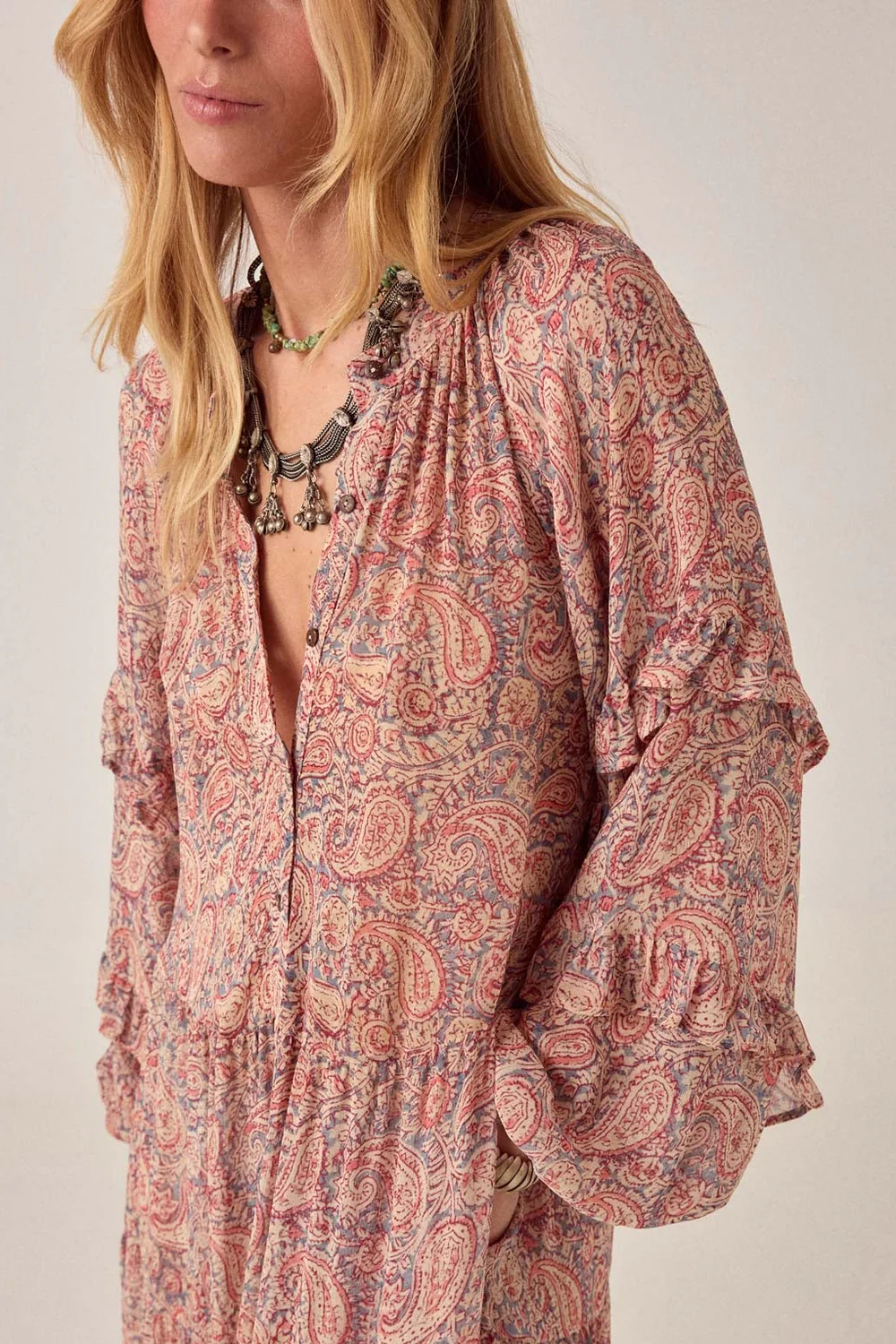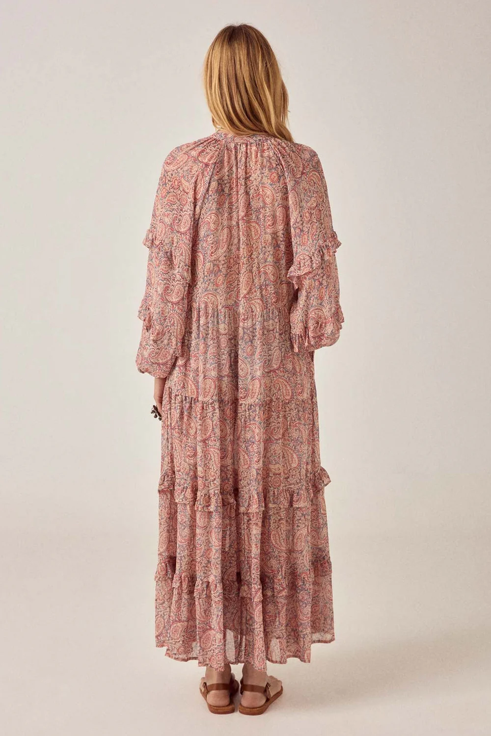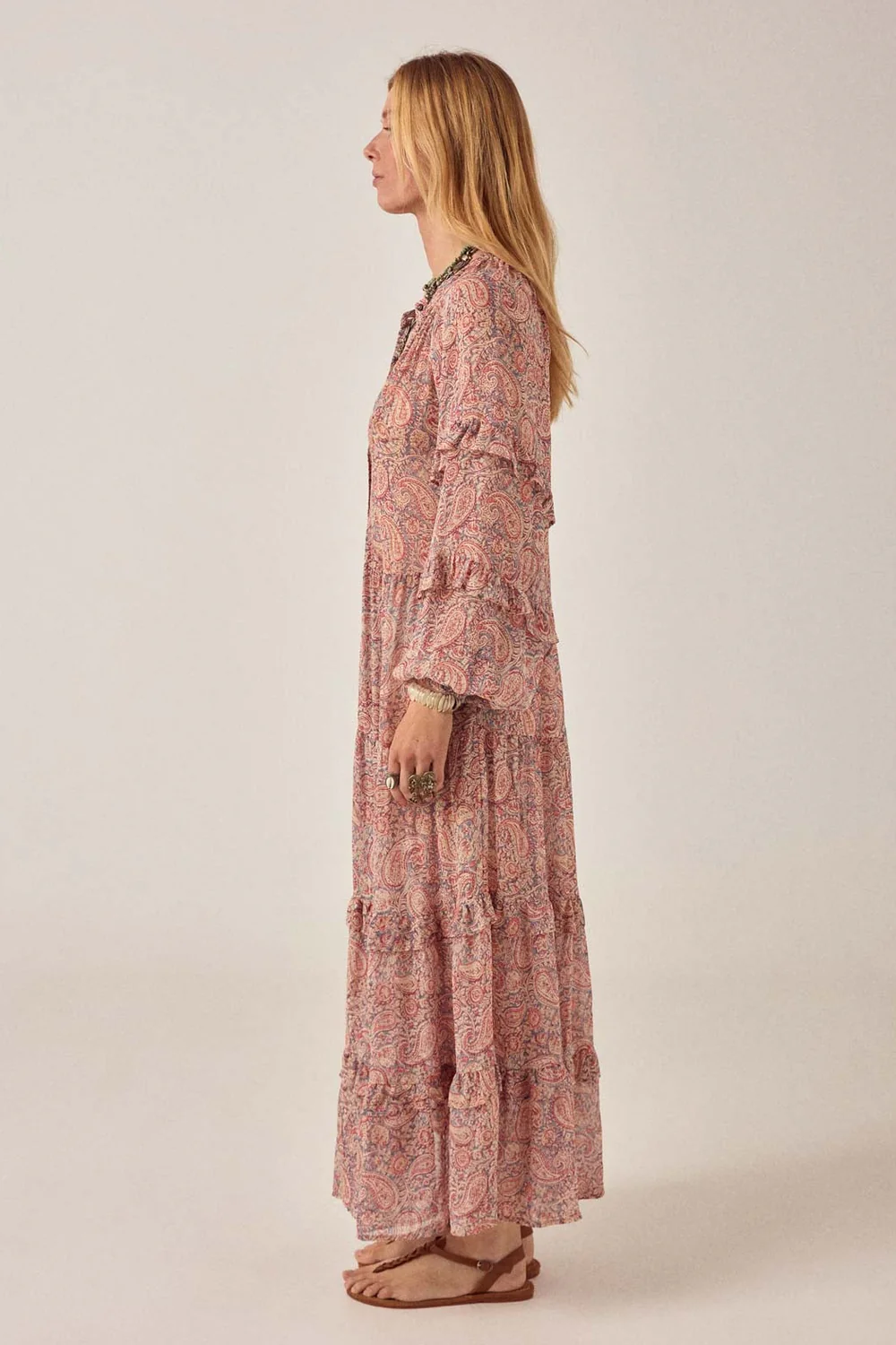 En fantstiskt vacker klänning i ett underbart tyg, 100% viskos crepe, lös underklänning i tunn bomull. Mönstret är vackert mjukt hallonrosa, benvitt och blått, så mjukt fint ihop. Modellen är helknäppt framtill, små fina volanger på både kjol och ärm som är lös och vid, avskuren midja och extra tygbälte kommer med. Perfekt till sommarens fester och extra fina sommardagar.