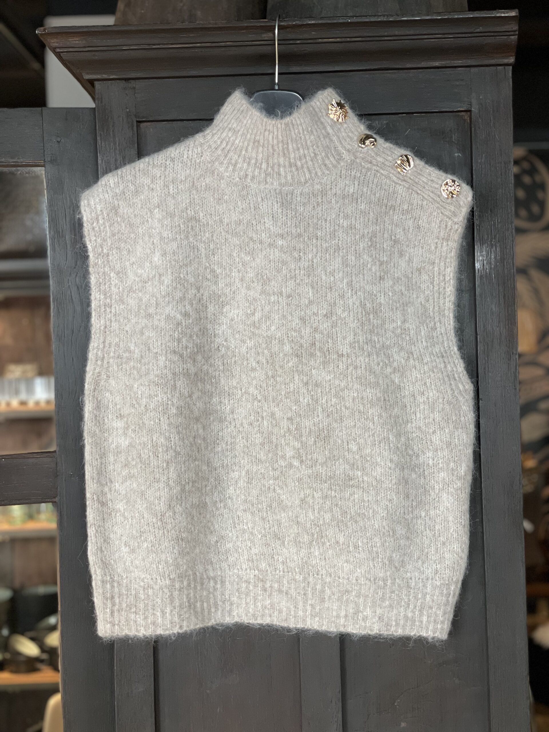 En snygg väst med halvpolokrage och fina guldknappar på ena axeln vilket gör att man kan knäppa upp och vika ner kragen om man har en skjorta under. Snygg beige färg och garnet har lite lyster i sig.One size passar upp till 42