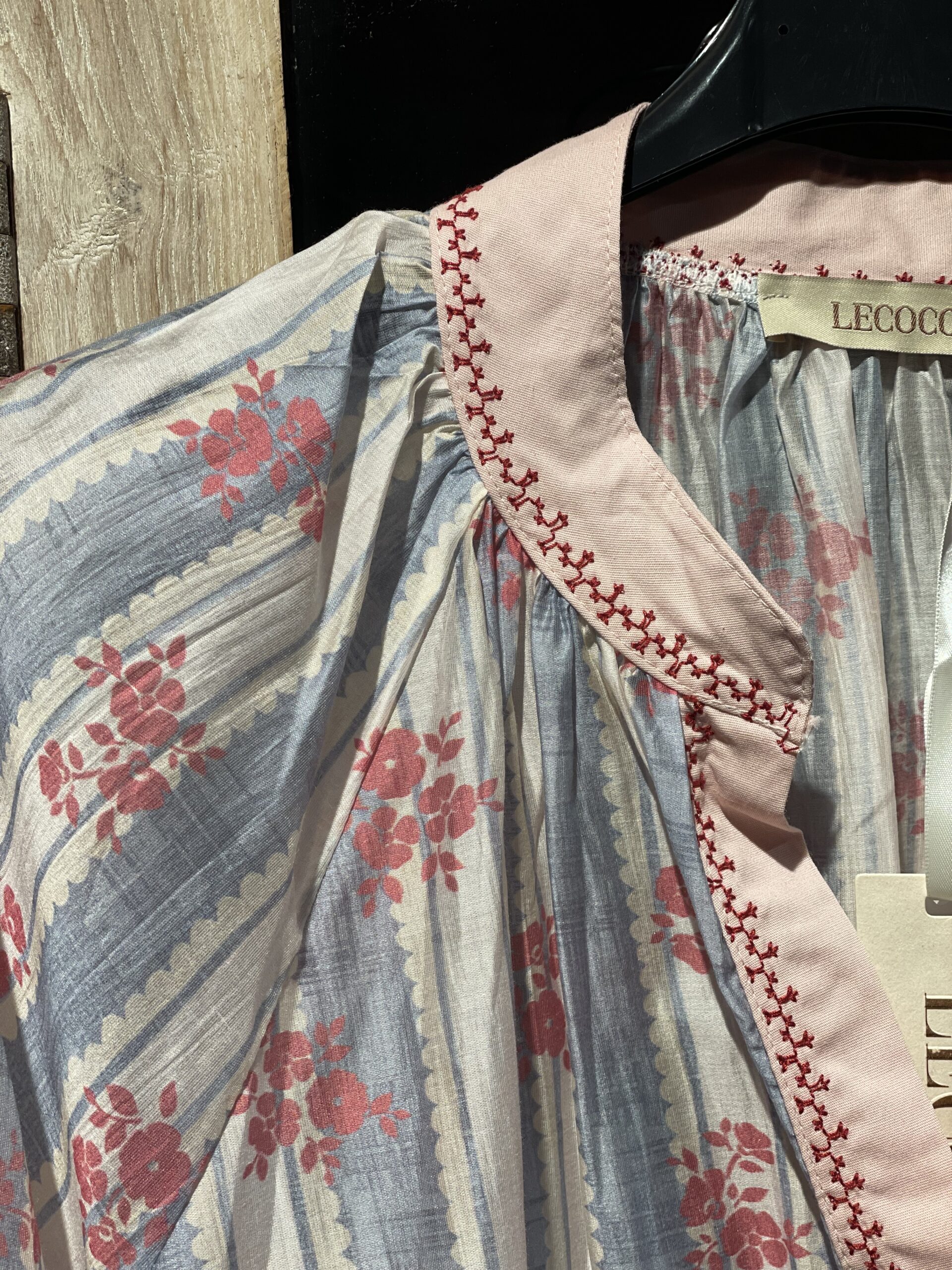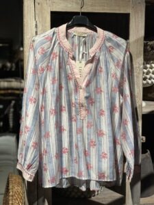 En jättevacker blus i ett underbart fint tunt tyg i mjuka färger och ett litet fint blommönster, botten är ljusblå, cremevit i mjuka ränder. Halsslå samt knappslå fram och manschetten på ärmarna är i ett enfärgat rosa tyg med fint broderat mönster. Blusen är vid och rymlig, bär den utanpå eller stoppa in den. Magiskt fin blus detta är en av Susannes favoriter denna våren.