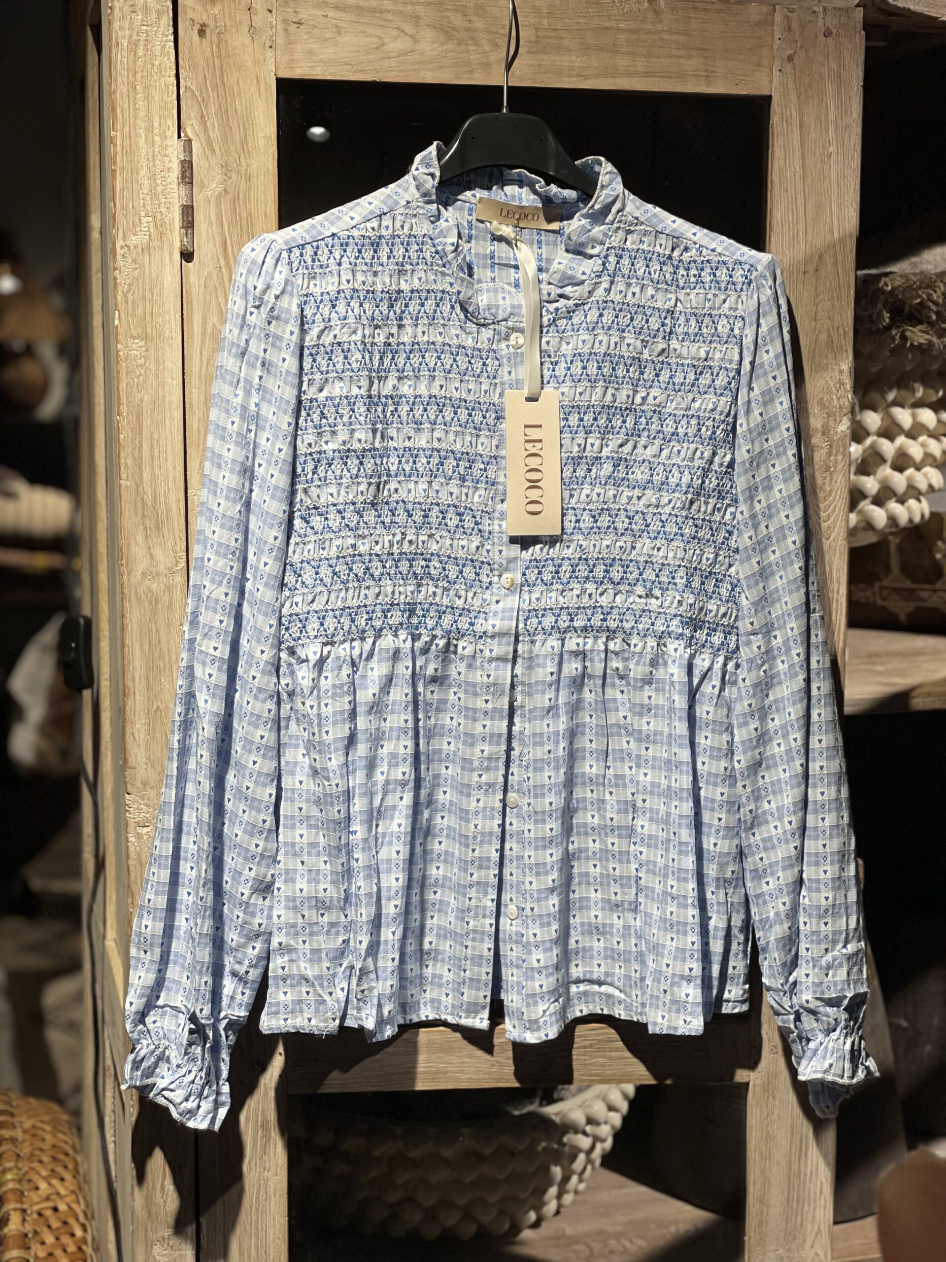 Ljusblått fint mönster på vit botten, smock på överdelen vilket gör att den sitter fint, liten fin ståkrage och rynk med resår vid ärmslutet. 100% bomull, kommer i storlekar S/M/L/XL fintvätt 30grader.