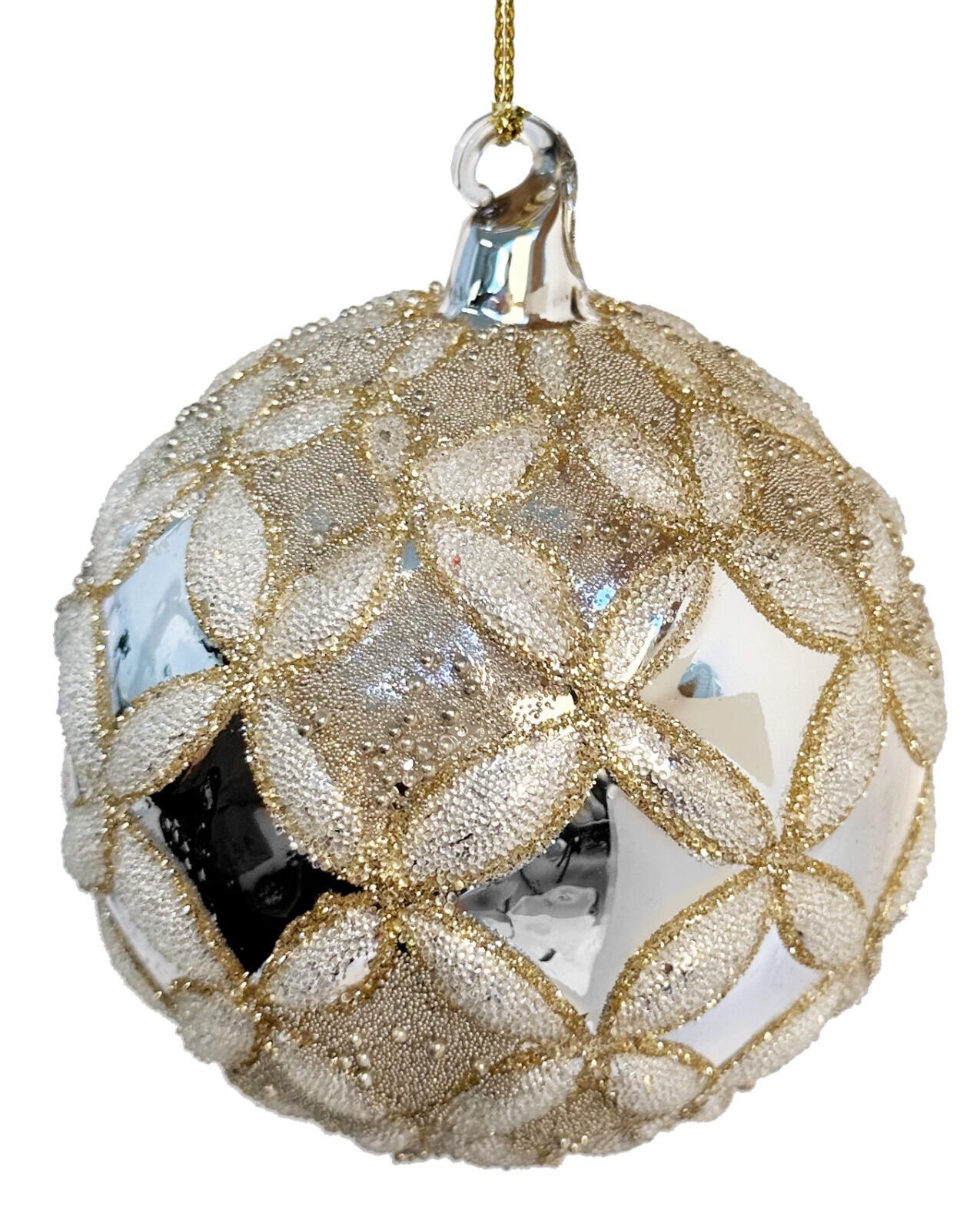 En julgranskula med en boho-luxe stil. Denna glaskula pryds av vackra blommor av guld- och silverfärgat glitter och små guldpärlor. Julkulan Snowflower är en vacker juldekoration med blommönster i guld och silver med en speglande grund i silver. Denna julgransdekoration är 10 cm i storlek, gjord av glas. Köp denna julgranskula och den kommer att bidra med ett festligt utseende till din julgranen. Variera gärna med fler av våra julgranskulor i samma nyans.