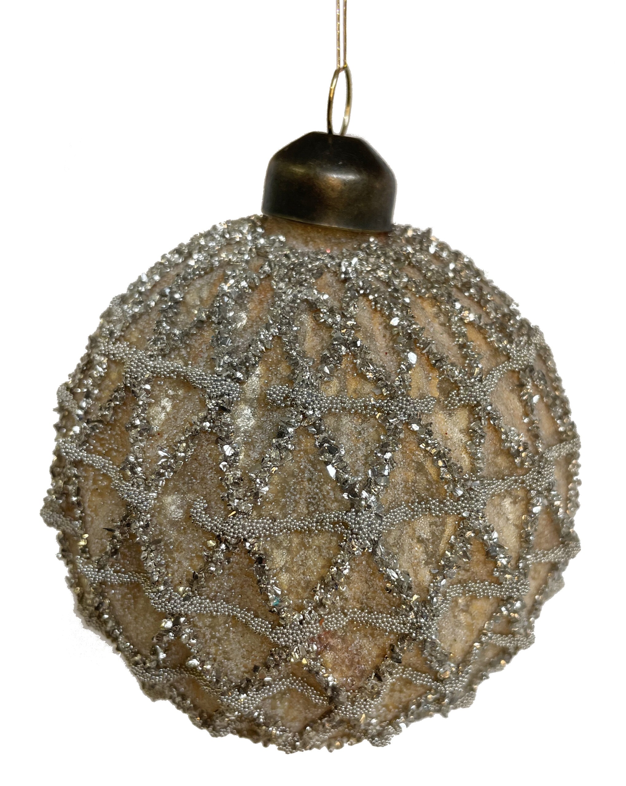 En julgranskula med ett anikt utseende. Denna glaskula har ett nätmönster av glitter som ser ut som socker och frost. Julgransdekorationen är 8 cm i storlek, gjord av glas och har en antik guldfärg. Denna julgransdekoration kommer bidra med ett festligt utseende till din julgranen. En fantastisk juvel att hänga i din julgran.
