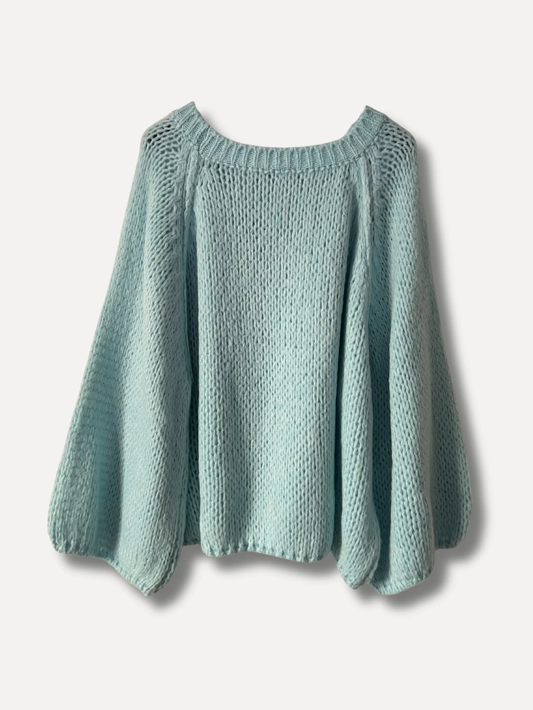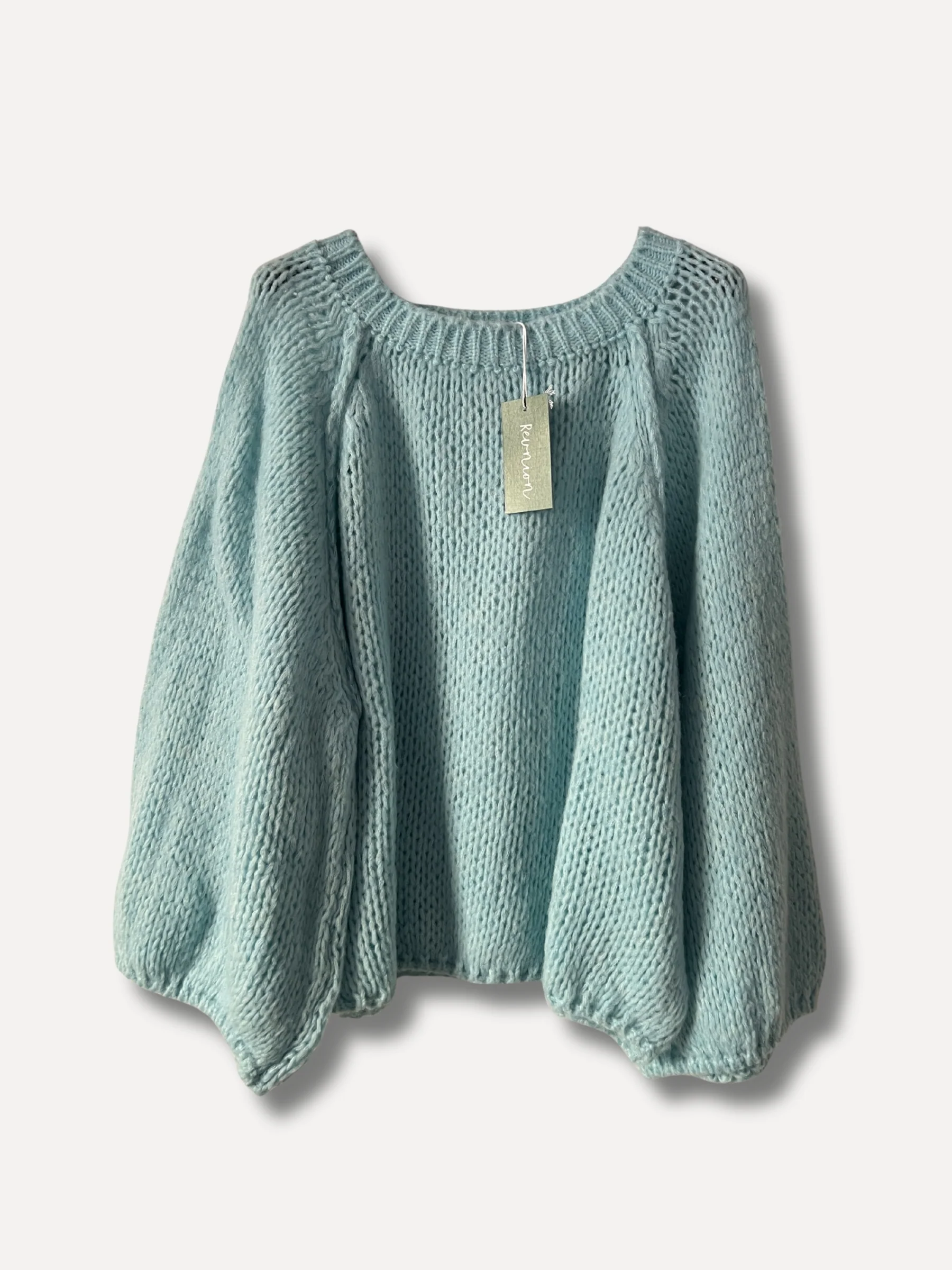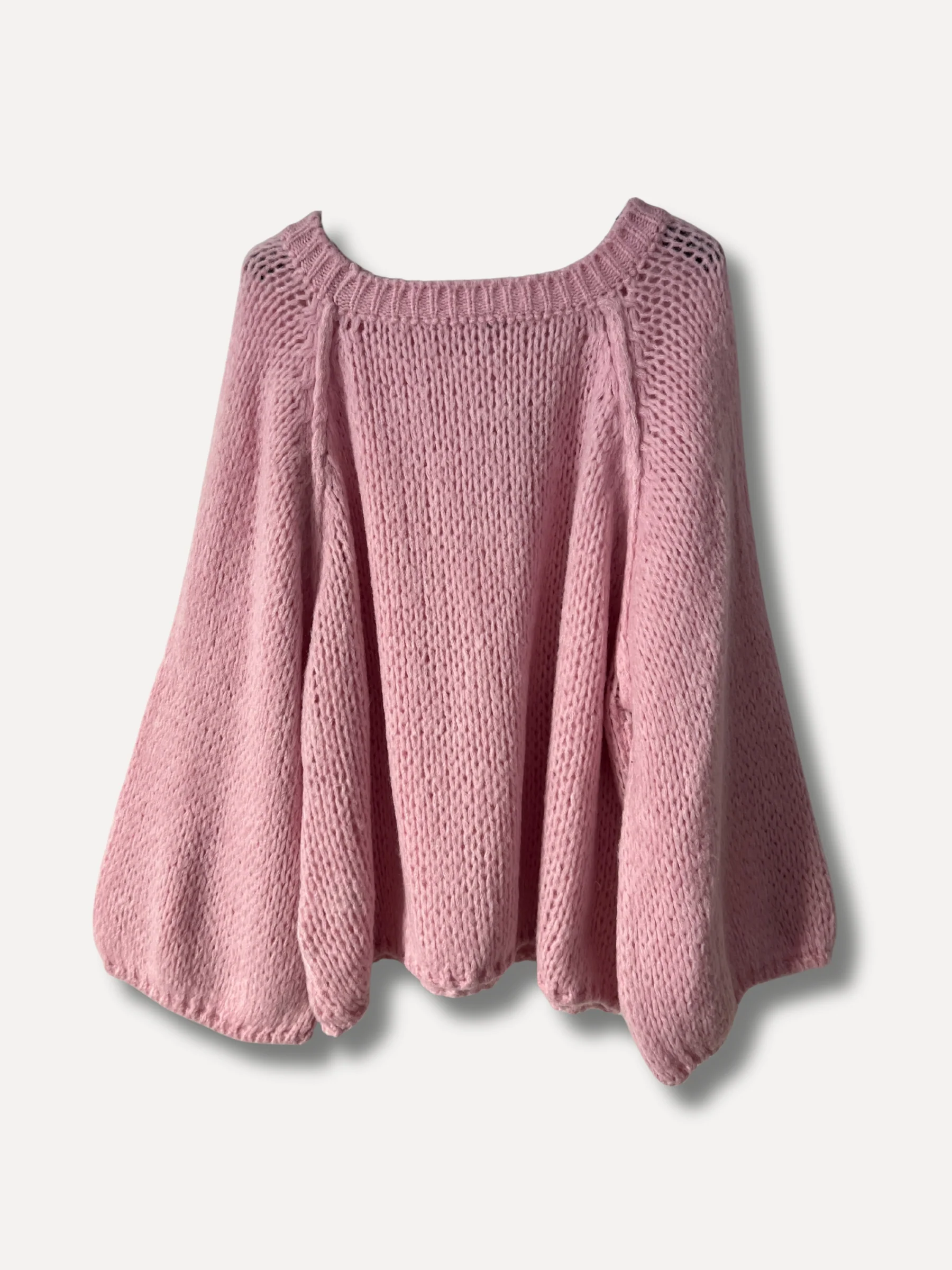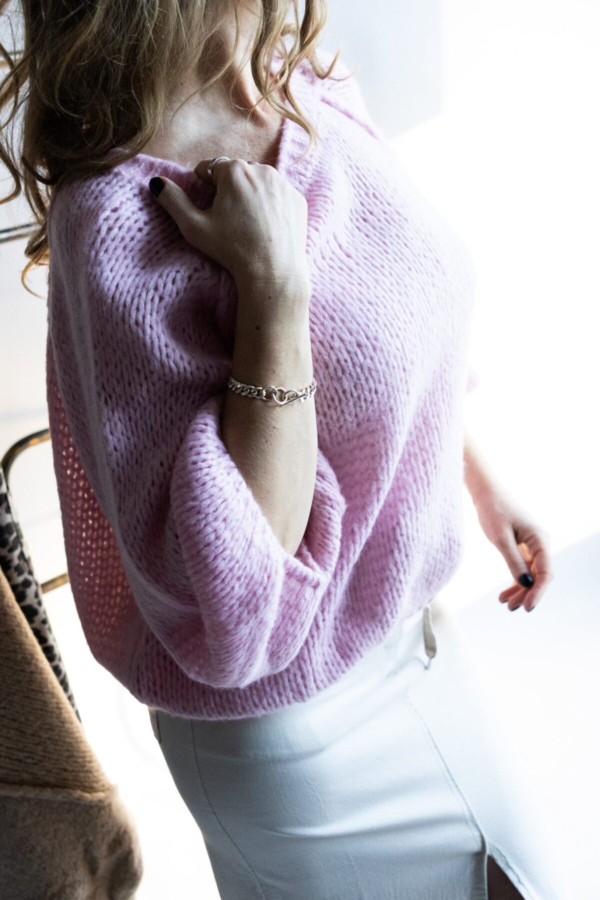 Underbar stickad mjuk tröja i en lite upphottad klassisk “Olle” tröja, Följsam rymlig modell som blir din favorit tröja att vara både vacker och må bra i. Finns i två färger ljusblå och rosa, one size.