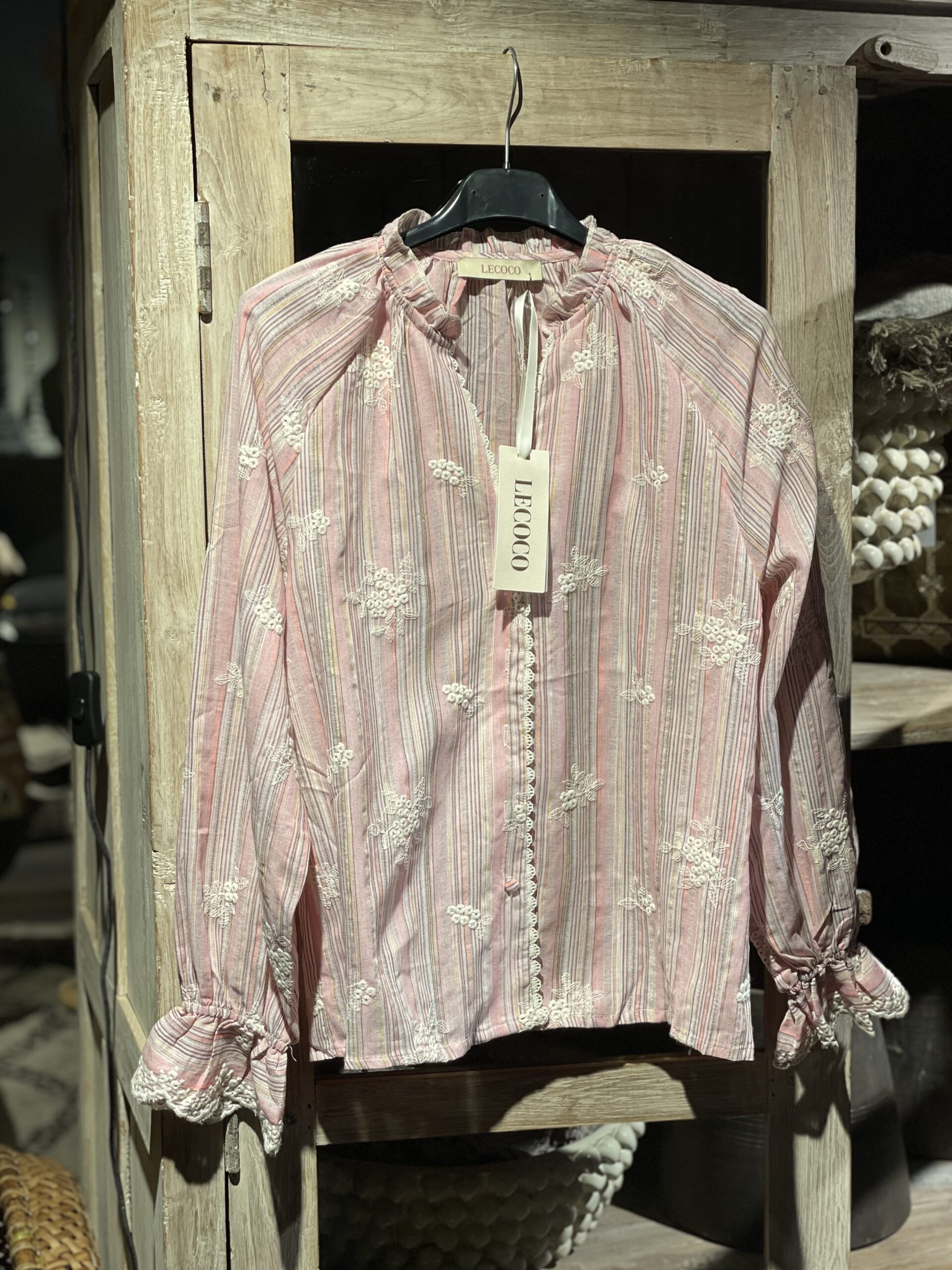Ljusrosa söt Bohoblus med ett vackert broderat blommotiv i vitt, fin rund ståkrage ,knäppning hela vägen fram och ärmen har ett avslut av resår med volangkant. Så fin till vita jeans eller vita linnebyxor i sommar, kommer i storlek S/M/L/XL 100% bomull